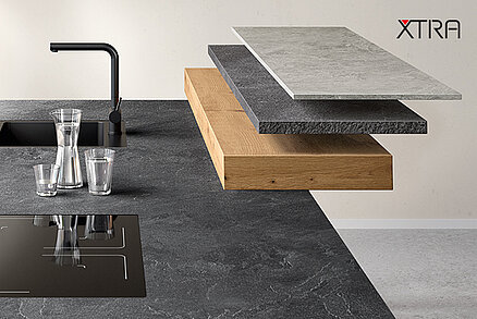 La encimera patentada Xtra Ceramic se fabrica en una innovadora estructura de sándwich. La encimera de 16 mm de grosor está hecha de 6 mm de cerámica maciza sobre una capa portante ligera de 10 mm de vidrio reciclado. Por tanto, en combinación con un borde de diseño insensible a los impactos, la Xtra Ceramic es ideal para las exigencias de la vida cotidiana en la cocina. Gracias a la superficie estética y resistente a los arañazos y a su condición impermeabilidad, la encimera también es apta para su uso en el cuarto de baño y le confiere a la sala de estar un look natural. Como con las encimeras Xtra, las placas de cocción con tecnología homologada y los fregaderos integrados pueden instalarse a ras con la superficie.